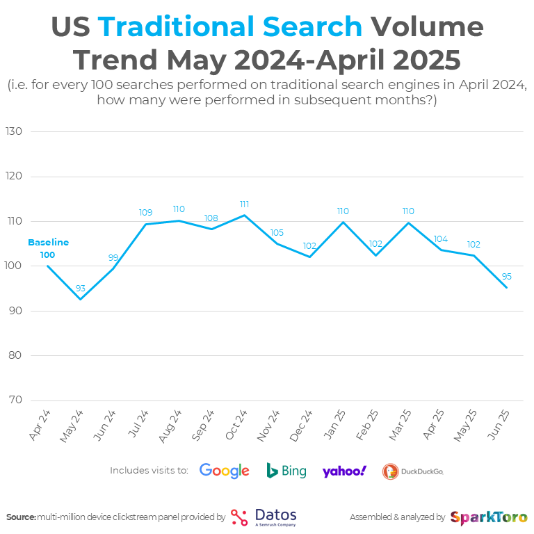 Un dato curioso: 25 % de los usos de ChatGPT en EE.UU. son educativos. Ensayos, tareas, proyectos de estudiantes. Eso explica la caída veraniega: cuando hay vacaciones escolares, las métricas de IA se desploman. Los buscadores, en cambio, no conocen estaciones: hay búsquedas de tráfico, recetas y clima los 365 días.